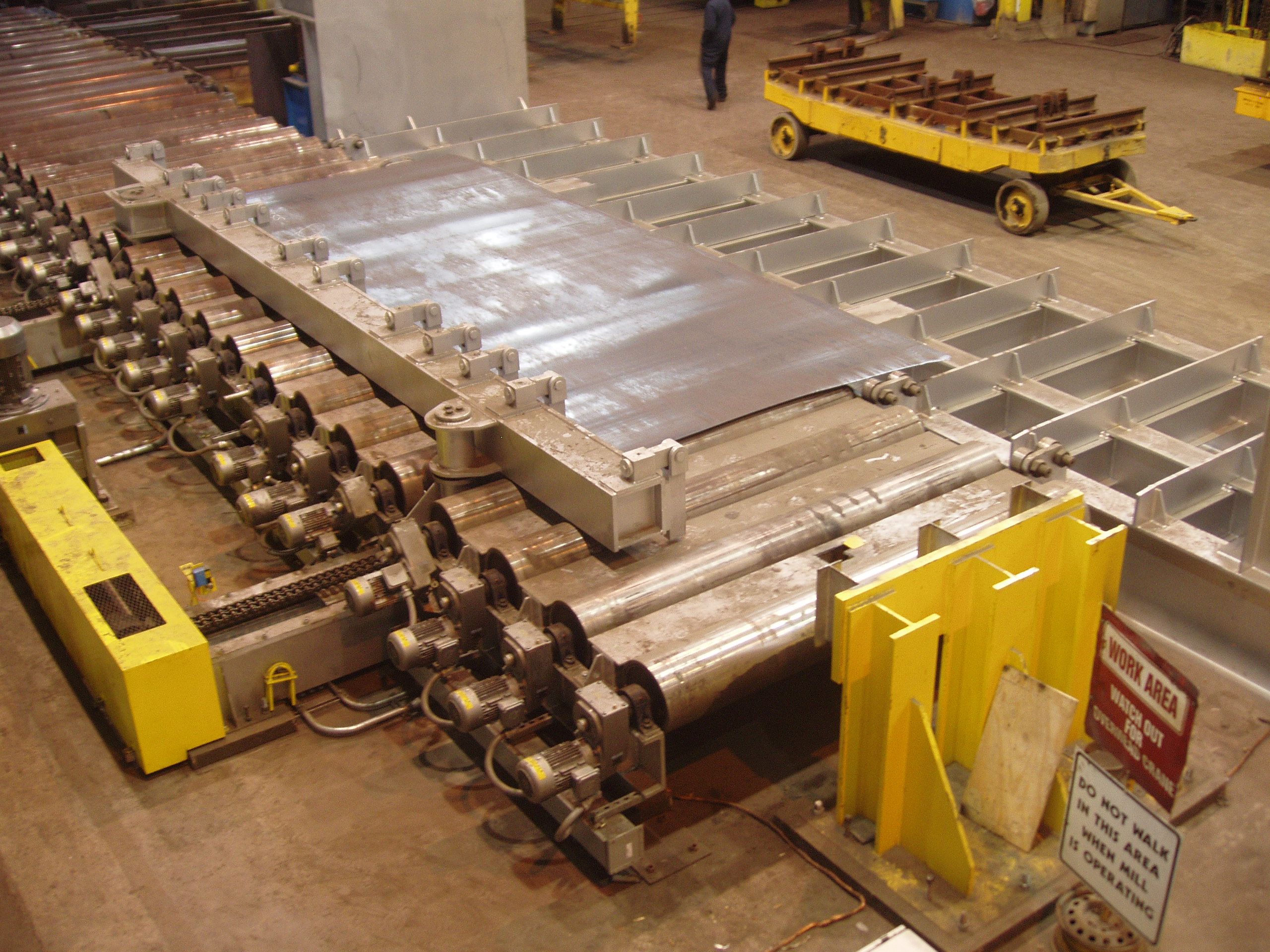 Here plates are stacked while still hot off the rolling mill. Plates are pushed off onto the rack, which then descends as the stack is built. After the stack is removed, the rack raises to the starting position.
