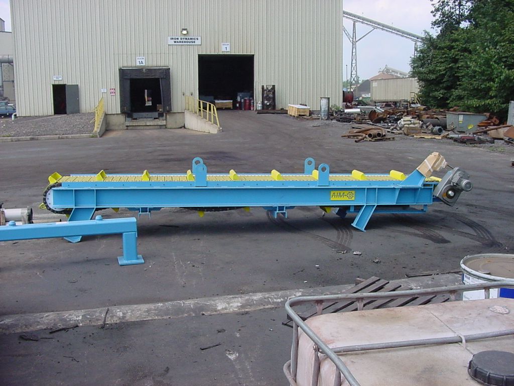 This continuous clean-out conveyor will be submerged in a rotary hearth furnace water seal drop box. The combination of flat treads and buckets effectively convey all sizes of material falling off the rotary hearth into the water seal.