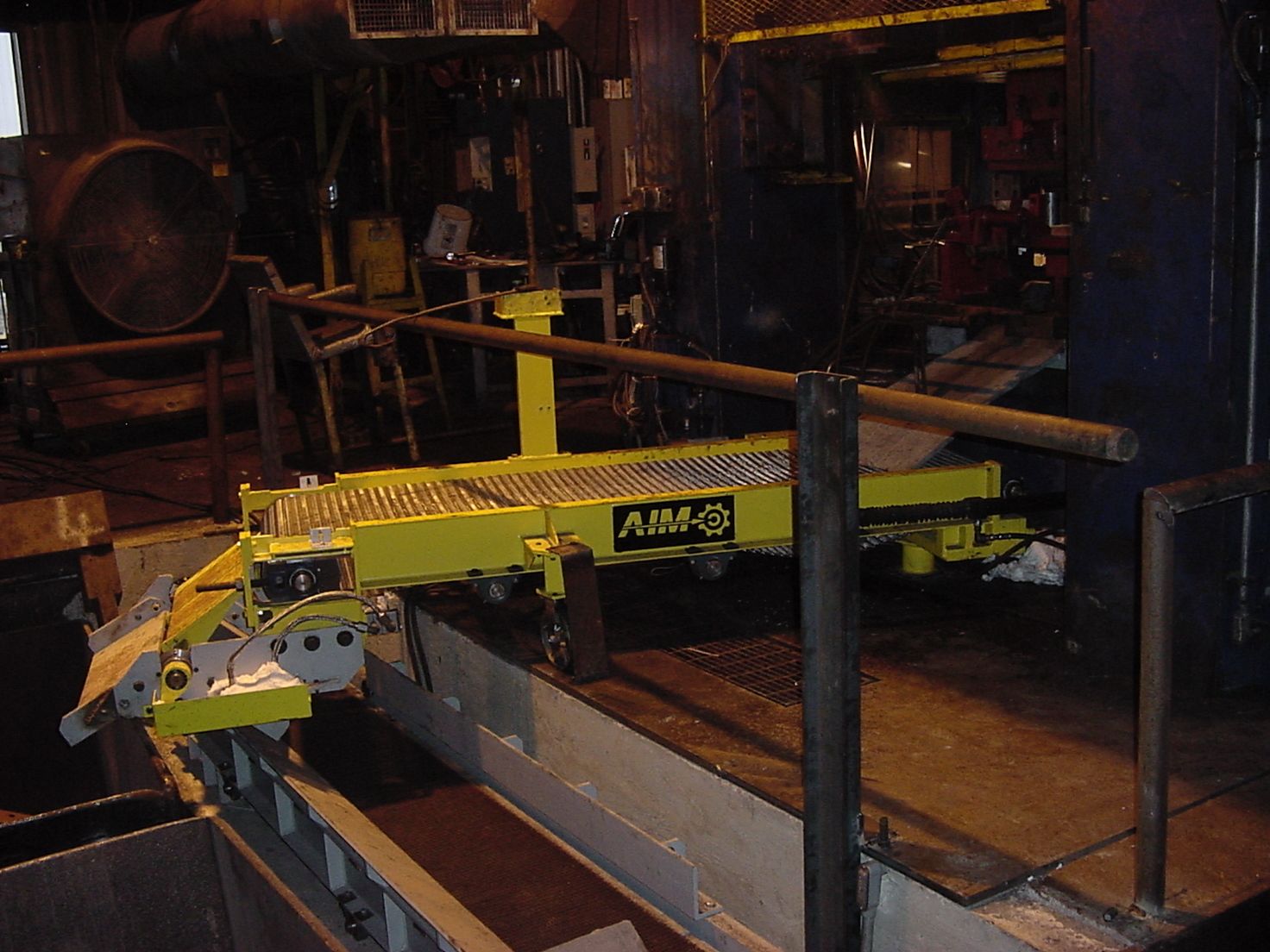 This device receives red-hot product off a stamping press, and conveys it to one of two finished product buckets, or to the reject conveyor.